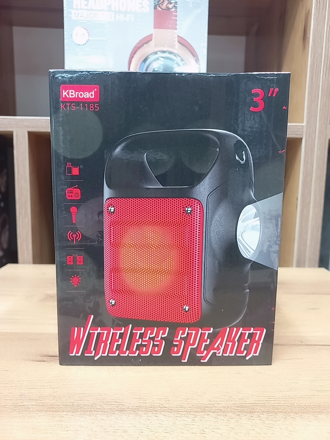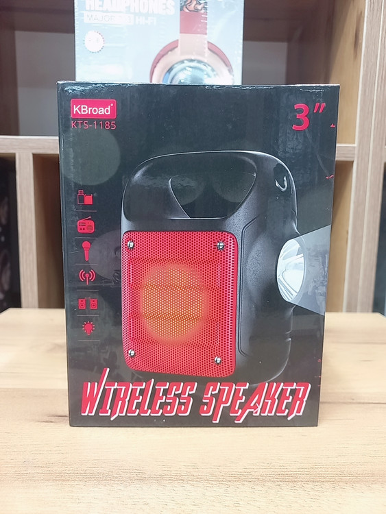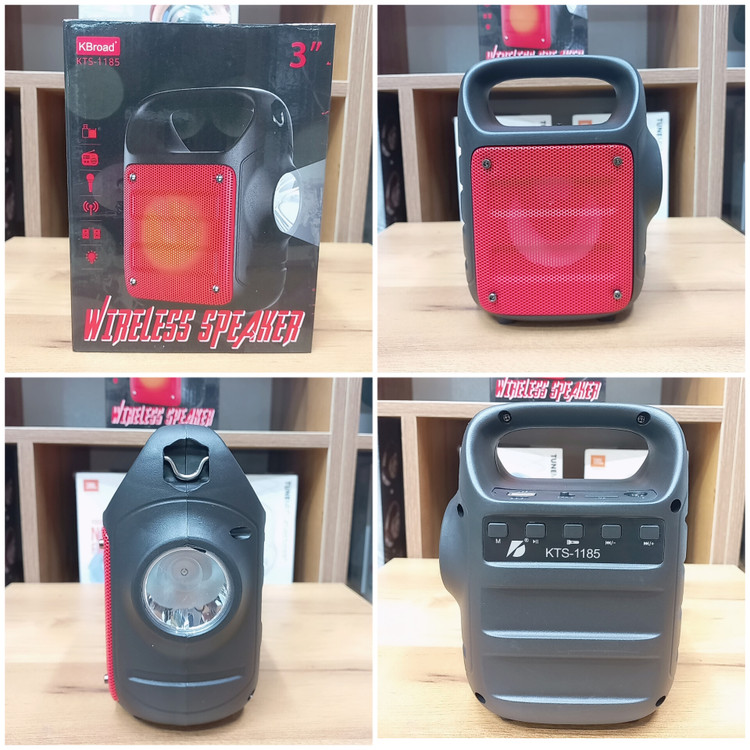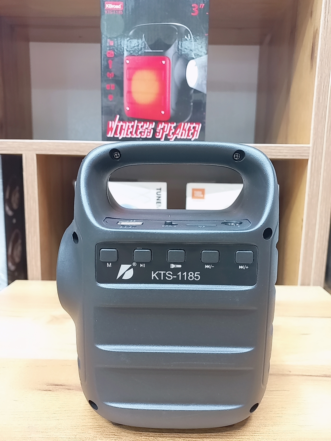 اسپیکر قابل حمل KTS-1185 مجهز به چراغ LED قوی دارای سه حالت زیاد- متوسط و چشمک زن میباشد که از این اسپیکر قابل حمل میتوان به عنوان چراغ شارژی نیز استفاده نمود ، این اسپیکر دارای باند خروجی به قطر سه اینچ و توان 5 وات با کیفیت صدای بسیار مناسب میباشد.با این اسپیکر میتوان از طريق فناوري بلوتوث به تلفنهمراه يا پخشکنندهي صوتي متصل شد. در قسمت بالایی اسپيکر يک درگاه USB و يک درگاه کارت حافظه به چشم ميخورد که از طريق آنها نيز میتوانید موسيقي دلخواهتان را گوش دهيد .این اسپیکر توانایی پشتیبانی از کارت حافظه و USB با ظرفیت 32 گیگا بایت را دارد. از ويژگي هاي ديگر اين اسپيکر ميتوان به راديو FM و ورودی میکروفون اشاره کرد. این اسپیکر دارای باطری قابل شارژ نیز میباشد. وجود نور با چندین رنگ متفاوت در قسمت جلویی اسپیکر، زیبایی خاصی را ایجاد نموده است .